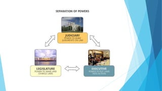 Montesquieu developed the theory of separation of powers which proposes dividing the sovereign power of a state among legislative, executive, and judicial branches. This was intended to prevent tyranny and protect liberty. He argued each branch should have distinct and independent powers to check the others. While complete separation is impossible, the theory emphasizes limiting concentration of power. It influenced government designs like the US Constitution's system of checks and balances among the three branches.