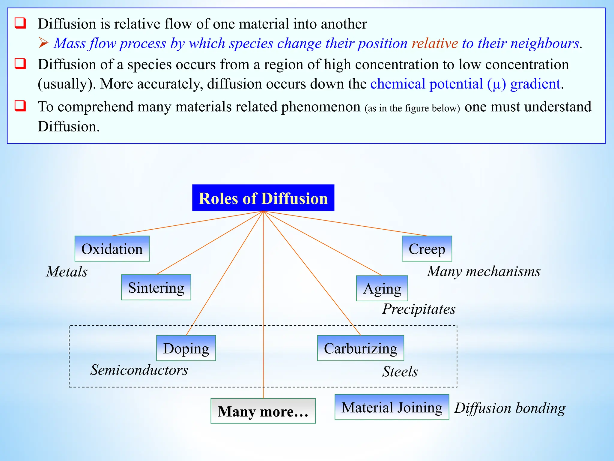 This document discusses mass transfer and diffusion fundamentals. It defines key terms like concentration, concentration gradient, steady state, and different types of concentrations used to measure species in a mixture. Fick's Laws of diffusion are also summarized, stating that the molar flux of a species is proportional to its concentration gradient, with diffusivity being the constant of proportionality. Different frames of reference for observing diffusion and equations for molar and mass flux and average velocities are provided.