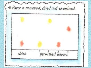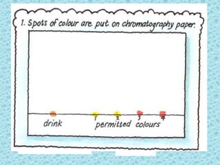 This chapter discusses separation techniques including chromatography, filtration, crystallization, and distillation. Chromatography involves using a solvent to separate mixtures into individual components by exploiting differences in how substances migrate across a medium. Filtration separates solids from liquids by passing a mixture through a filter. Crystallization and distillation are other common separation methods. The document provides detailed procedures and diagrams for each technique.