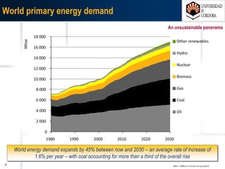 The document discusses the transformation of the global energy system towards smarter grids. It notes that population growth, urbanization, climate change and other factors are increasing global energy demand in an unsustainable way based on fossil fuels. This is creating challenges around energy security, costs and emissions. The development of smart grids aims to address these challenges by modernizing energy infrastructure with intelligent monitoring, control and communication technologies to integrate renewable energy, empower consumers and optimize the system. The transition to smarter grids is a major opportunity but also faces barriers around technologies, policies and industry transformation.