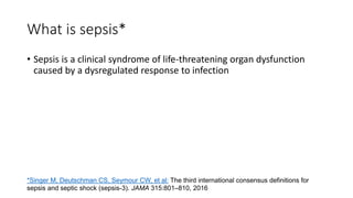 Sepsis is a life-threatening organ dysfunction caused by a dysregulated response to infection. Septic shock, a subset of sepsis, involves circulatory and cellular abnormalities with high mortality. Sepsis signs include temperature changes, increased heart and breathing rates, and abnormal white blood cell counts. Diagnosis involves assessing these signs, blood pressure, lactate levels, and cultures of potential infection sources. Treatment focuses on rapidly restoring perfusion with IV fluids and antibiotics, controlling the infection source, and supporting organ functions.