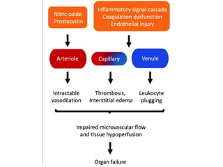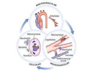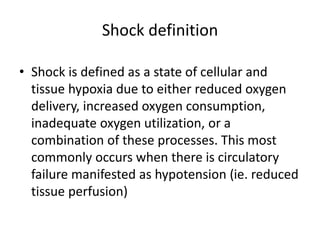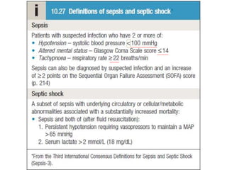 The document discusses sepsis and septic shock. It defines shock and classifies different types including cardiogenic, hypovolemic, anaphylactic, septic, and neurogenic shock. It describes the systemic inflammatory response syndrome (SIRS) criteria. Non-infective processes like trauma or surgery can also cause SIRS. Investigations for sepsis may include blood cultures, imaging, and biomarkers like procalcitonin. Positive findings include leukocytosis/leukopenia, thrombocytopenia, organ dysfunction, hyperglycemia, and hyperlactatemia. Early goal-directed resuscitation including antibiotics, fluid resuscitation, and inotropes can improve outcomes in septic shock.