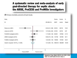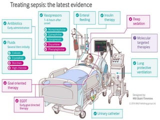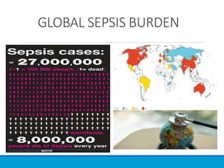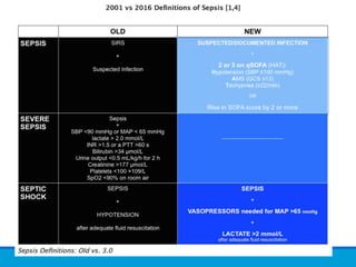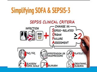 The document discusses recent advancements in the understanding and management of sepsis and septic shock, emphasizing updated definitions, treatment protocols, and the importance of early identification using tools like SOFA and qSOFA scores. It outlines specific resuscitation strategies, including fluid management, the use of antibiotics, and the potential role of adjunct therapies like corticosteroids and vitamin cocktails. The document highlights the necessity for timely intervention to improve patient outcomes and reduce mortality rates associated with these critical conditions.