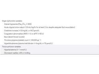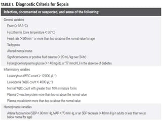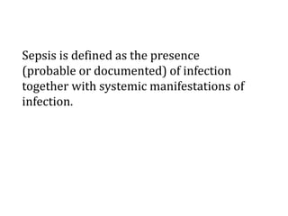 Sepsis is defined as infection plus systemic manifestations of infection. Severe sepsis is defined as sepsis with organ dysfunction or tissue hypoperfusion. Initial resuscitation goals include maintaining a central venous pressure of 8-12 mmHg, mean arterial pressure of at least 65 mmHg, urine output of 0.5 mL/kg/hr, and oxygen saturation of 70% or higher. Effective intravenous antimicrobials should be administered within one hour of recognizing sepsis or septic shock. Source control and infection prevention are also important aspects of treatment.