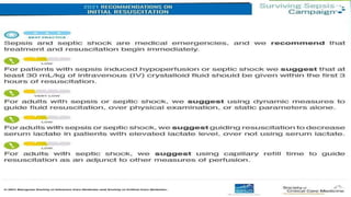 The document outlines guidelines for managing sepsis and septic shock, emphasizing the importance of early identification and treatment. Key recommendations include maintaining a mean arterial pressure of 65 mm Hg, using crystalloids as the first-line fluid for resuscitation, and prioritizing norepinephrine as the primary vasopressor. Additional suggestions address fluid management strategies, monitoring approaches, and the cautious use of alternative vasopressors when norepinephrine is unavailable.