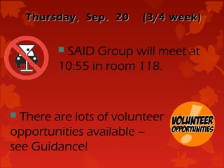 The document is a daily announcement sheet for a school that provides information about upcoming events, activities, and reminders for the week of September 20th. It includes details about new bell times, spirit day dress up, volunteer opportunities, sports team meetings and games, a BBQ event, and cafeteria specials. It also provides reminders about the dress code and prohibited items like colognes, sunflower seeds, skateboards, and hats.