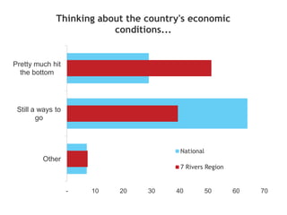 The document summarizes an economic update for the 7 Rivers Region. It includes a standard disclaimer and introduces recession indicators. It then discusses how politicians have little control over the economy compared to larger market forces. The remainder outlines an agenda with questions on tax structure, workforce development, eliminating ineffective spending, income tax reform, supporting industry clusters, and creating an economic development investment fund.