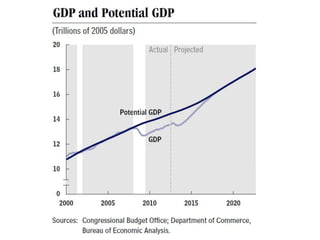 1) Charts showing GDP growth in the US and Europe since 2008, with the US seeing a decline before recovering while southern European countries like Spain and Italy saw continued declines.