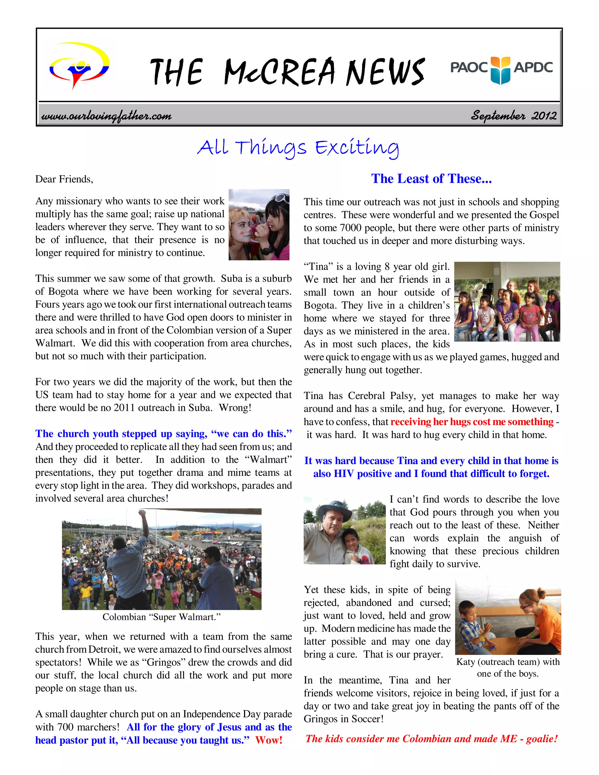 1) The missionary work in Colombia has grown such that local churches are now leading outreach efforts without the missionaries, including replicating and expanding on previous activities.