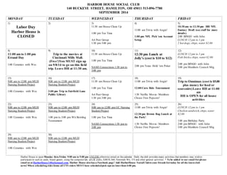 The document is a calendar for September 2014 for the Harbor House Social Club located in Hamilton, OH. It lists the daily activities and events for each date, including house clean up, tea time, art groups, trivia, bingo, movies, ceramics, nursing student projects, poker, and more. Lunch is served daily from 12-1pm for $2 and includes items like hot dogs, fish sticks, or chicken sandwiches. The club is open Monday through Friday from 9am-5pm unless otherwise noted, and provides daily activities for members.