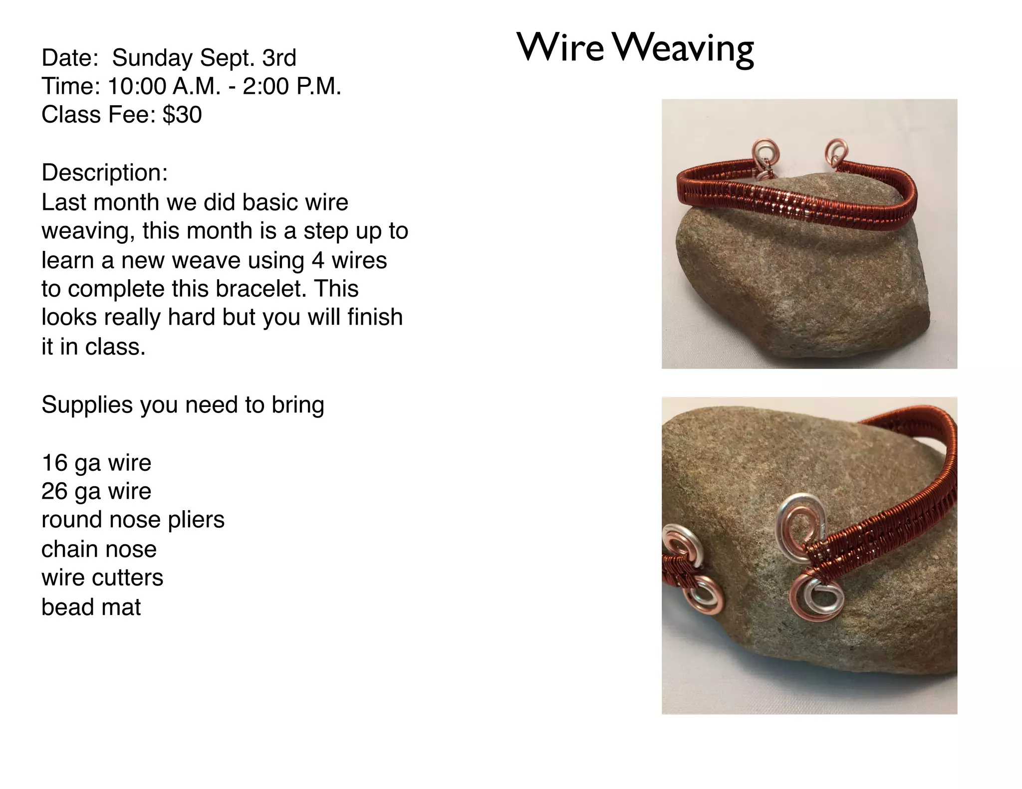 The document provides information on three upcoming jewelry making classes: 1) A wire weaving class on September 3rd costing $30 where students will learn a new 4-wire bracelet weave. Students must bring their own tools and materials. 2) A stamped pendant class on September 10th costing $55 where all materials are included. Students will learn layering and stamping techniques. 3) The class scheduled for September 17th may be replaced, as the instructor will be teaching jewelry making at a camping event that weekend. Details of any replacement class will be emailed separately.