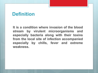 Septicaemia, or blood poisoning, is a condition where bacteria and their toxins invade the bloodstream from a local infection, causing symptoms like fever, chills, and weakness. It affects over 30 million people worldwide annually and leads to 6 million deaths. Risk factors include older age, comorbidities, prolonged antibiotic or steroid use, and prolonged hospitalization. Common causes are bacteria like Staphylococcus aureus, Escherichia coli, and fungi such as Candida species. Treatment involves antibiotics, fluid resuscitation, and life support measures to address complications like shock, organ failure, and disseminated intravascular coagulation.