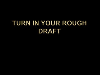 This document provides instructions and information about turning in assignments, peer reviewing student work, and the benefits of peer review. It discusses how to conduct a peer review session by having students read their paragraphs aloud without comments, then passing their work to the left to be reviewed by others. Reviewers are asked to highlight their comments in their assigned color and provide feedback focused on content. The document concludes by assigning a final draft of Paragraph #2 as homework.