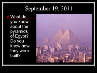 The document discusses the pyramids of Egypt, including how and why they were built. It explains that the oldest pyramids were step pyramids built in 2630 BCE for Pharaoh Djoser. The pyramids were built by Egyptians, including willing workers, to protect the body and possessions of the Pharaoh after death. The largest pyramid, the Great Pyramid, was built around 2550 BCE and was the world's tallest structure for nearly 4,000 years. The document also briefly mentions the Bent Pyramid and provides information about obelisks constructed by the Egyptians.