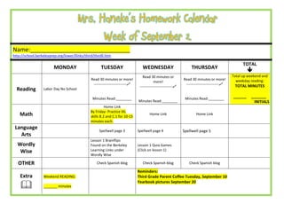 This document appears to be a student's weekly homework and reading log. It includes assignments for reading, math, language arts, and other subjects for each day of the week. The student is asked to record the number of minutes read each day and total minutes for the week. Other assignments include practicing math skills on IXL, completing pages in the Spellwell workbook, lessons in Wordly Wise, checking the Spanish blog, and noting minutes read over the weekend. Reminders at the bottom include an upcoming parent coffee and yearbook pictures.