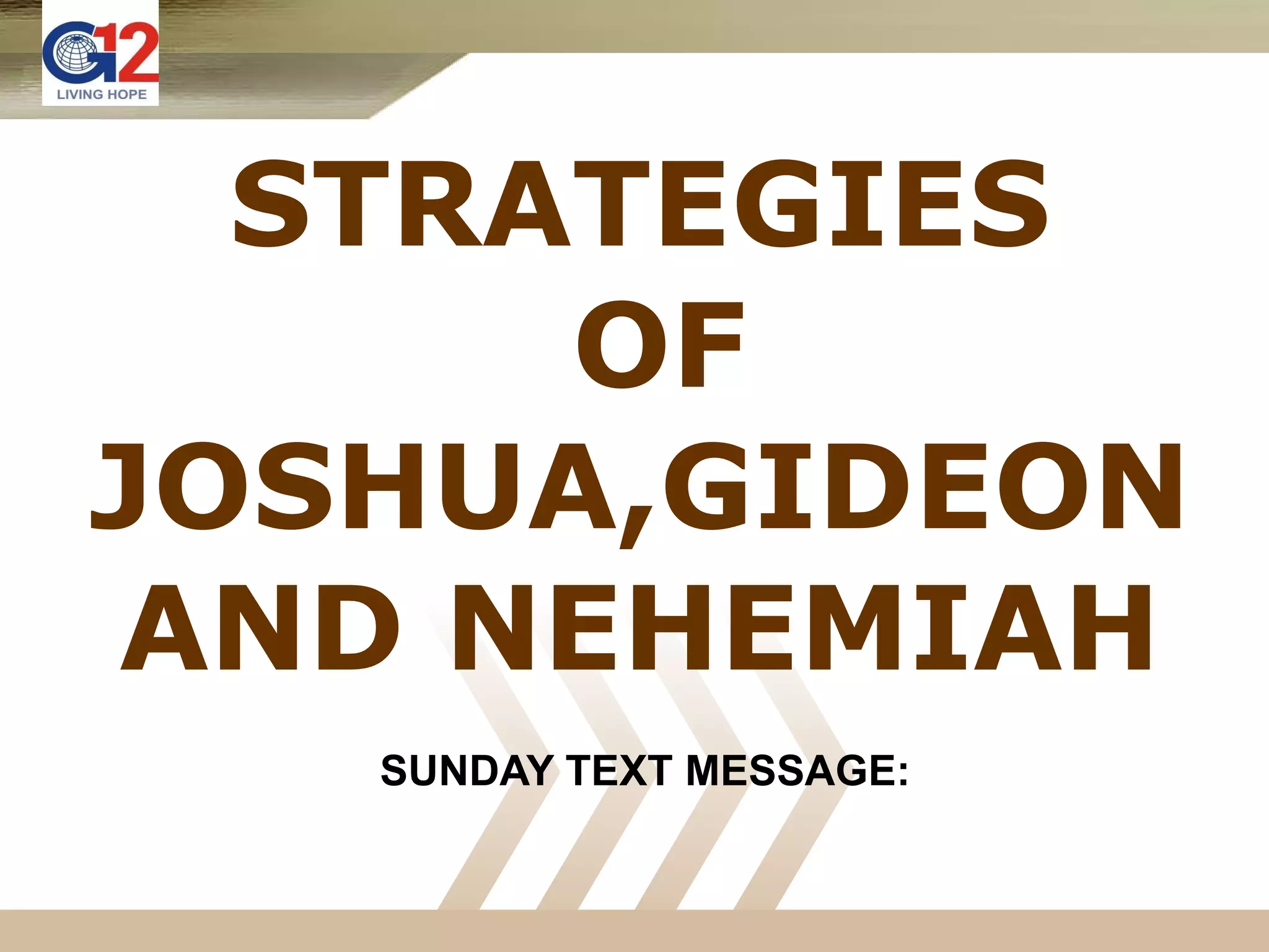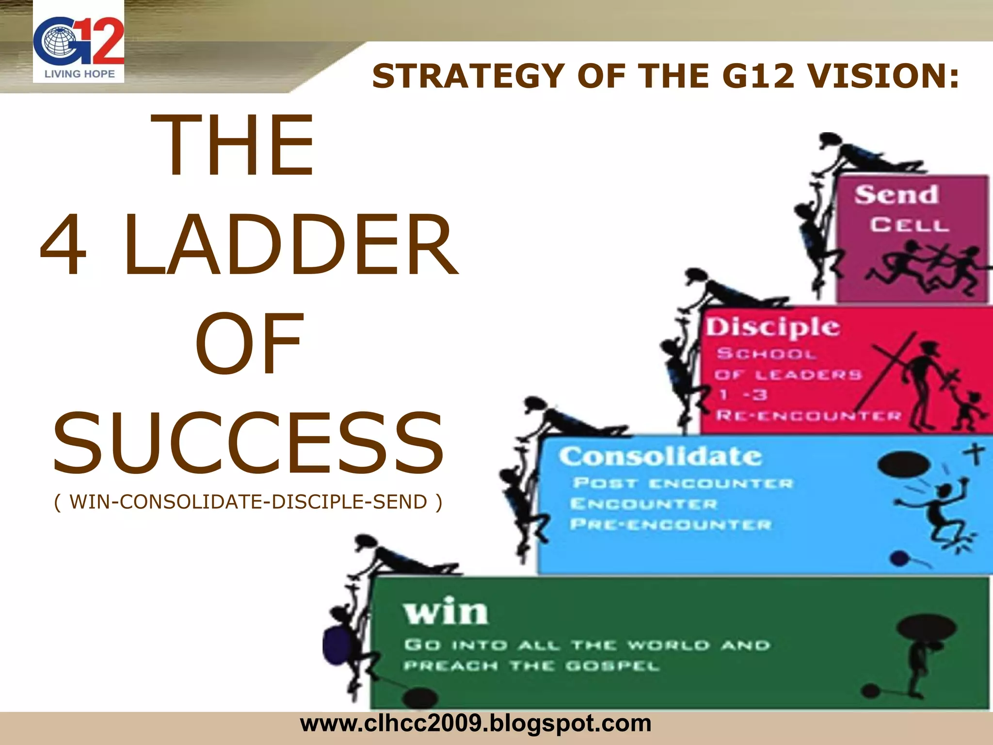 God gives strategies to accomplish his visions, as he did with Joshua, Gideon, and Nehemiah. Ptr. Cesar Castellanos was given the strategy of the "4 Ladder of Success" (Win-Consolidate-Disciple-Send) to accomplish the vision of growing the G12 church. The 4 steps guarantee success if followed closely. To succeed, one must understand the strategy, own it in their heart, join in its strict implementation, and observe teamwork in following it.
