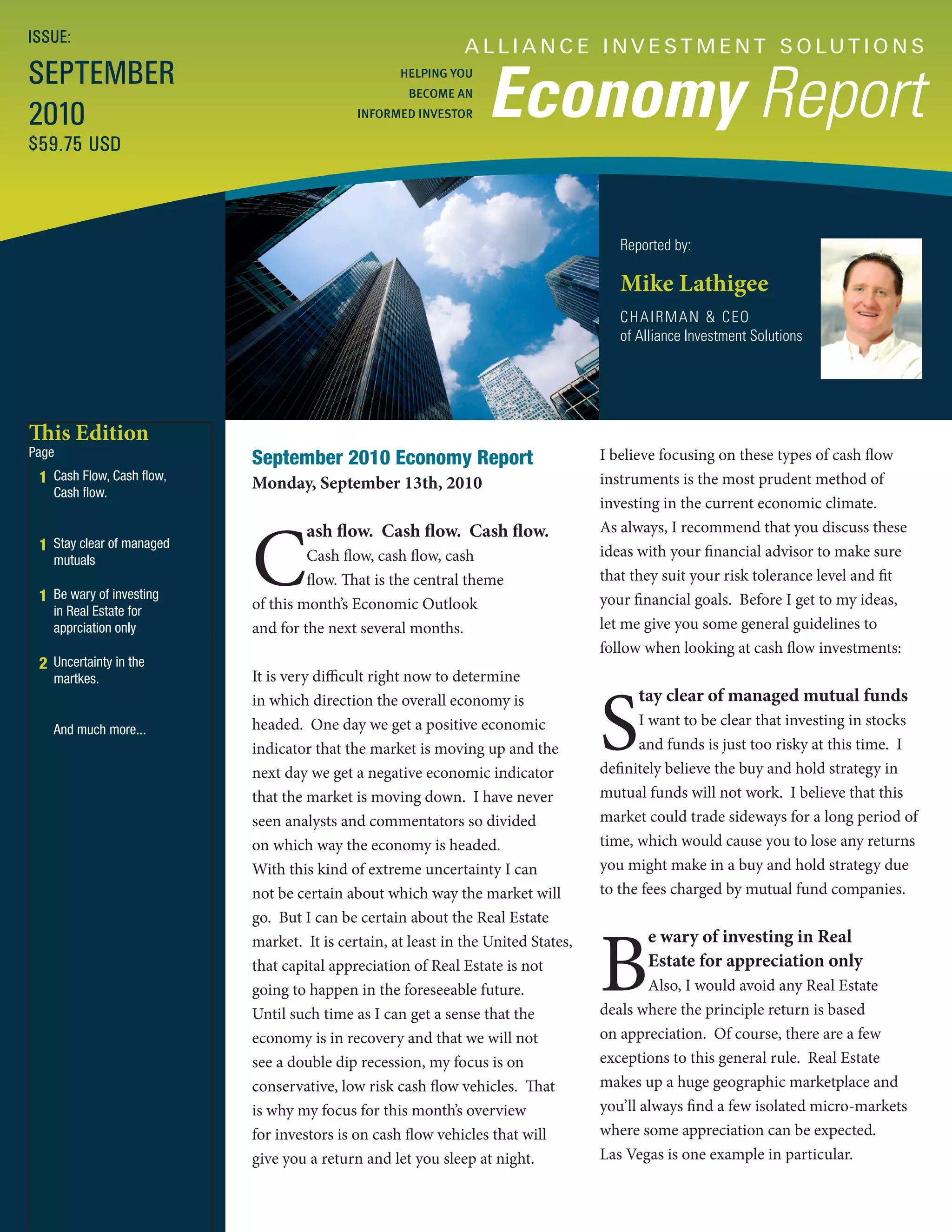 The document provides an economic outlook report for September 2010 by Mike Lathigee, Chairman and CEO of Alliance Investment Solutions. The summary is: