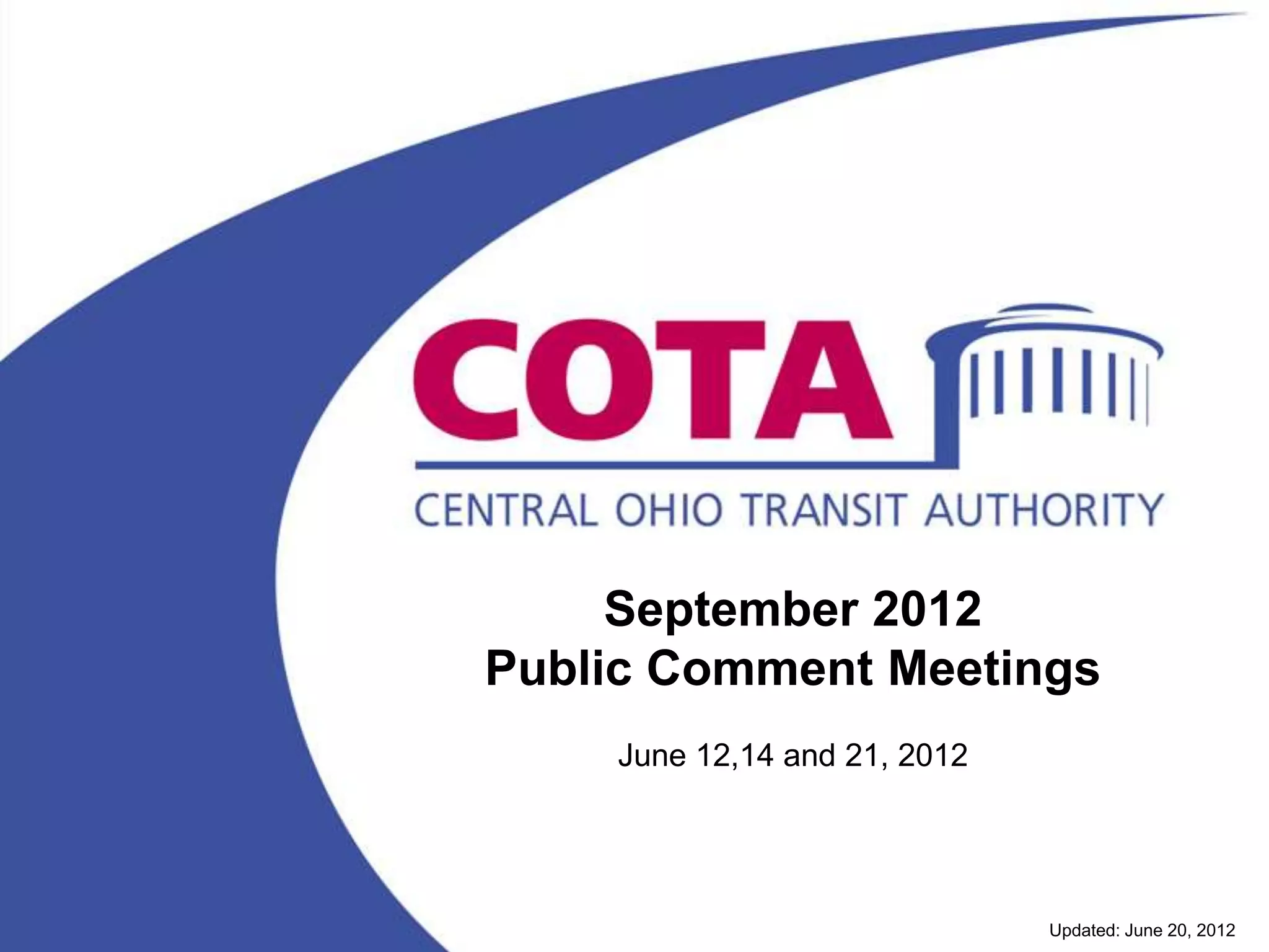 This document summarizes COTA's proposed service changes for September 2012. Major changes include realigning routes due to the reopening of the Dodridge Bridge and new service to the Hollywood Casino. Local and express routes will have minor adjustments to improve on-time performance. The Bus Stop Service Improvement Project will remove some stops on select routes. Public comments were encouraged on the proposals.
