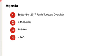 The document provides an overview of a Patch Tuesday webinar that took place on September 13, 2017, discussing significant security vulnerabilities and updates for various Microsoft products. It highlights notable breaches, including the Equifax breach, and outlines the severity and impact of several disclosed vulnerabilities. Specific Microsoft updates addressing these vulnerabilities are detailed, including required actions and known issues related to installation.