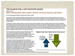 This document discusses the challenges facing journalism in the digital age. It notes that many newspapers have closed or cut staff since the early 2000s as circulation has declined sharply. The role of journalists is also changing as skills like video, audio, photography, and social media are increasingly important. New business models are being explored but none have fully replaced lost print revenue yet. The future of journalism appears to be focused on mobile platforms, though the industry still needs to understand audience behavior and find financial models that work well for mobile news.
