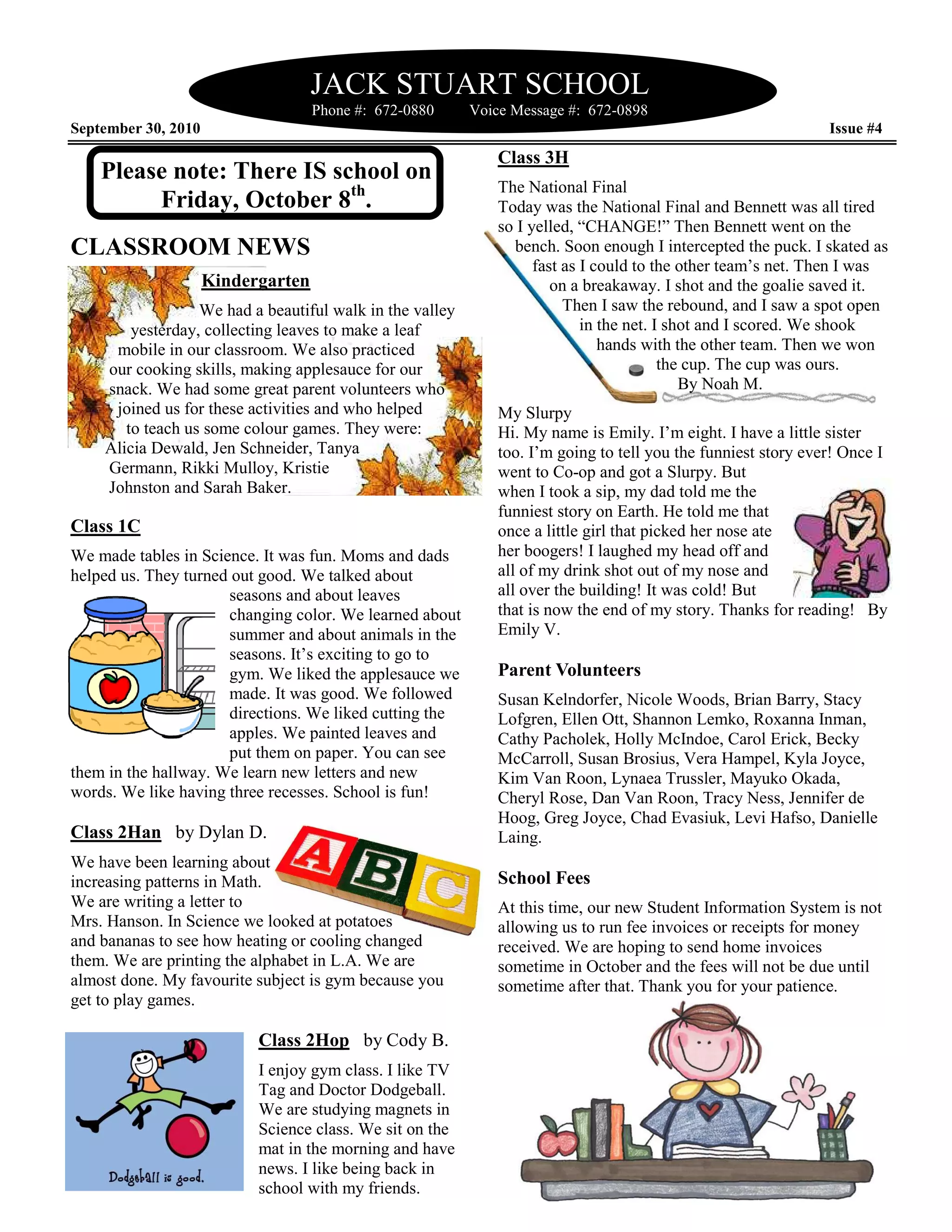The document is a newsletter from Jack Stuart School providing information to parents and students. It includes the following key points: