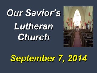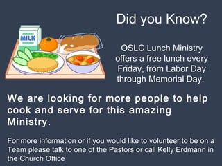 This document provides announcements and information for members of Our Savior's Lutheran Church. It includes details about volunteer opportunities, worship services, community outreach programs, and upcoming events at the church. Key points mentioned are a free Friday lunch ministry needing volunteers, fall/winter worship hours beginning in September, and a mosquito net fundraising campaign reaching its goal of purchasing over 500 nets for families in Africa.
