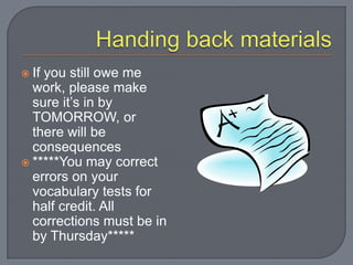 The 8th grade English class will be learning about and writing cinquain poems. Cinquains are 5-line poems that follow specific patterns. Students will be handed back previous assignments, given a new vocabulary list, learn about the three types of cinquains - word pattern, syllable pattern, and combination pattern, and have class time to write one of each type of cinquain to turn in the next day.