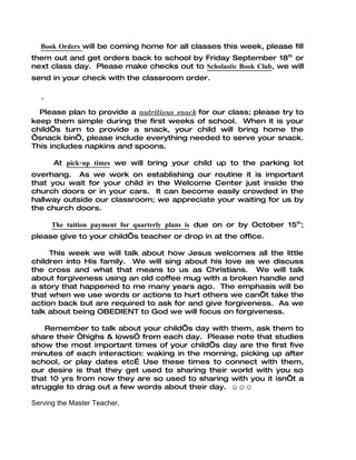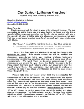 This document is a newsletter from Our Saviour Lutheran Preschool informing parents about upcoming events and focusing on establishing classroom routines in the first few weeks of school. It discusses an upcoming field trip, book orders, providing snacks for class, pick-up procedures, and tuition due dates. It also previews the faith-based lessons and Bible verses that will be taught that week, focusing on forgiveness and obedience to God.