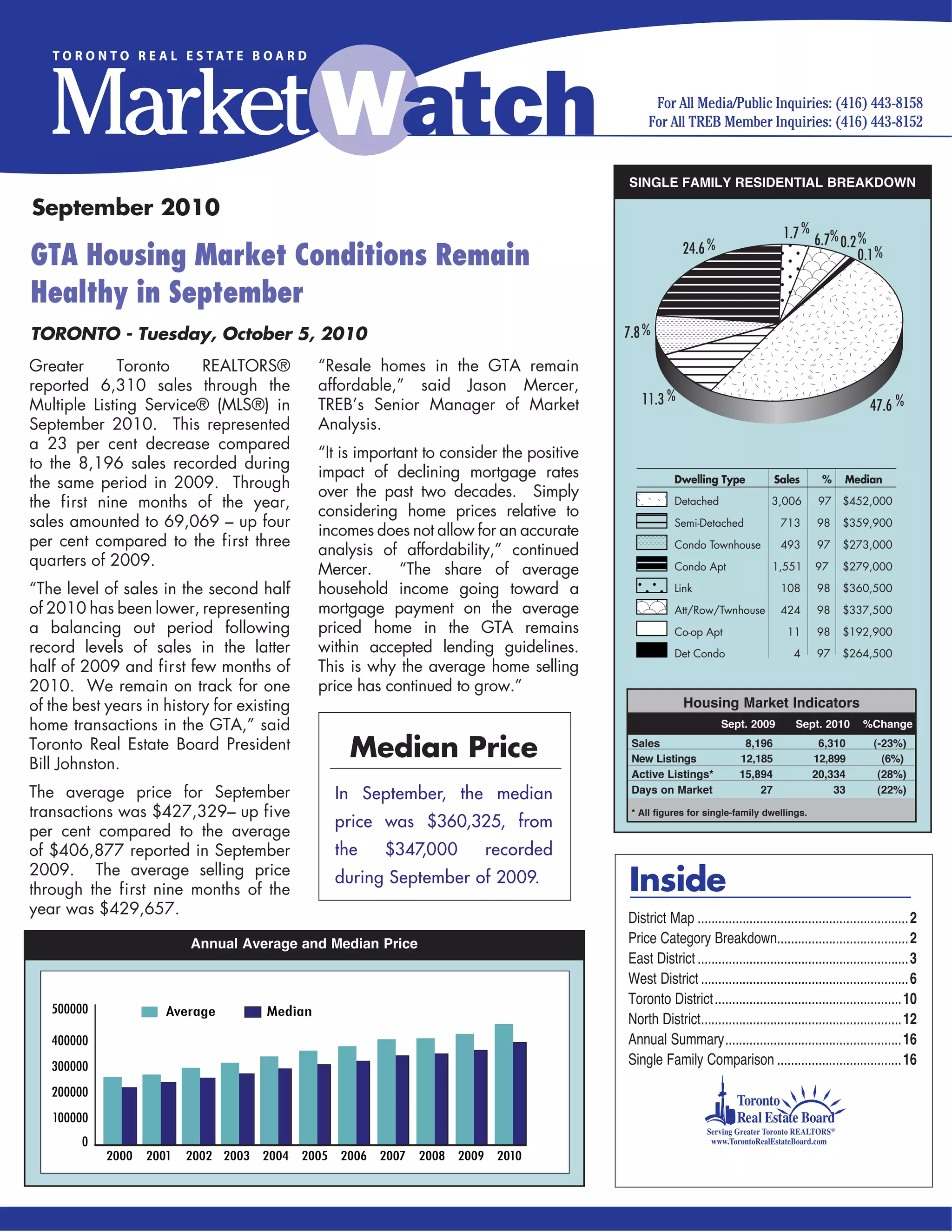 The document summarizes Toronto real estate market statistics for September 2001. It reports that home sales continued at record levels for the 5th consecutive month, with 5,021 single-family home sales. While sales remained strong, home prices fell slightly by 1% compared to the previous month and year. The summary also breaks down sales by property type and geographic areas within Toronto.