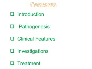 Septic arthritis is a joint infection caused by bacteria or other microbes entering the joint space. It leads to inflammation of the synovial membrane and purulent effusion. Common symptoms include pain, swelling, warmth and limited movement of the infected joint. Diagnosis involves synovial fluid analysis showing purulence and leukocytosis, along with supportive blood tests. Treatment is with antibiotics and surgical drainage may be needed. Complications can include bone and cartilage destruction, joint deformity, and secondary osteoarthritis.