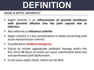 Septic arthritis is an inflammation of the synovial membrane caused by infection, manifesting as a medical emergency typically in cases of acute monoarticular arthritis. Risk factors include age, existing joint problems, immune system weakness, and certain medications, with the knee being the most commonly affected joint. Prompt diagnosis and treatment are crucial to prevent severe complications, including joint dysfunction and systemic infection.