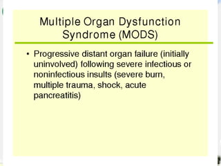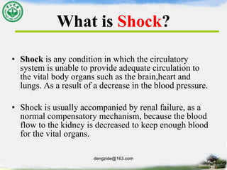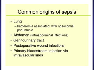 This document provides information on septic shock, including its causes, pathophysiology, clinical features, diagnosis, and management. Septic shock is a serious medical condition caused by infection and sepsis that results in decreased tissue perfusion and oxygen delivery. It can lead to multiple organ dysfunction syndrome and death, with a mortality rate of approximately 50%. Management involves identifying and treating the infection source, fluid resuscitation, vasopressor support, appropriate antibiotic therapy, and treating any organ dysfunction.