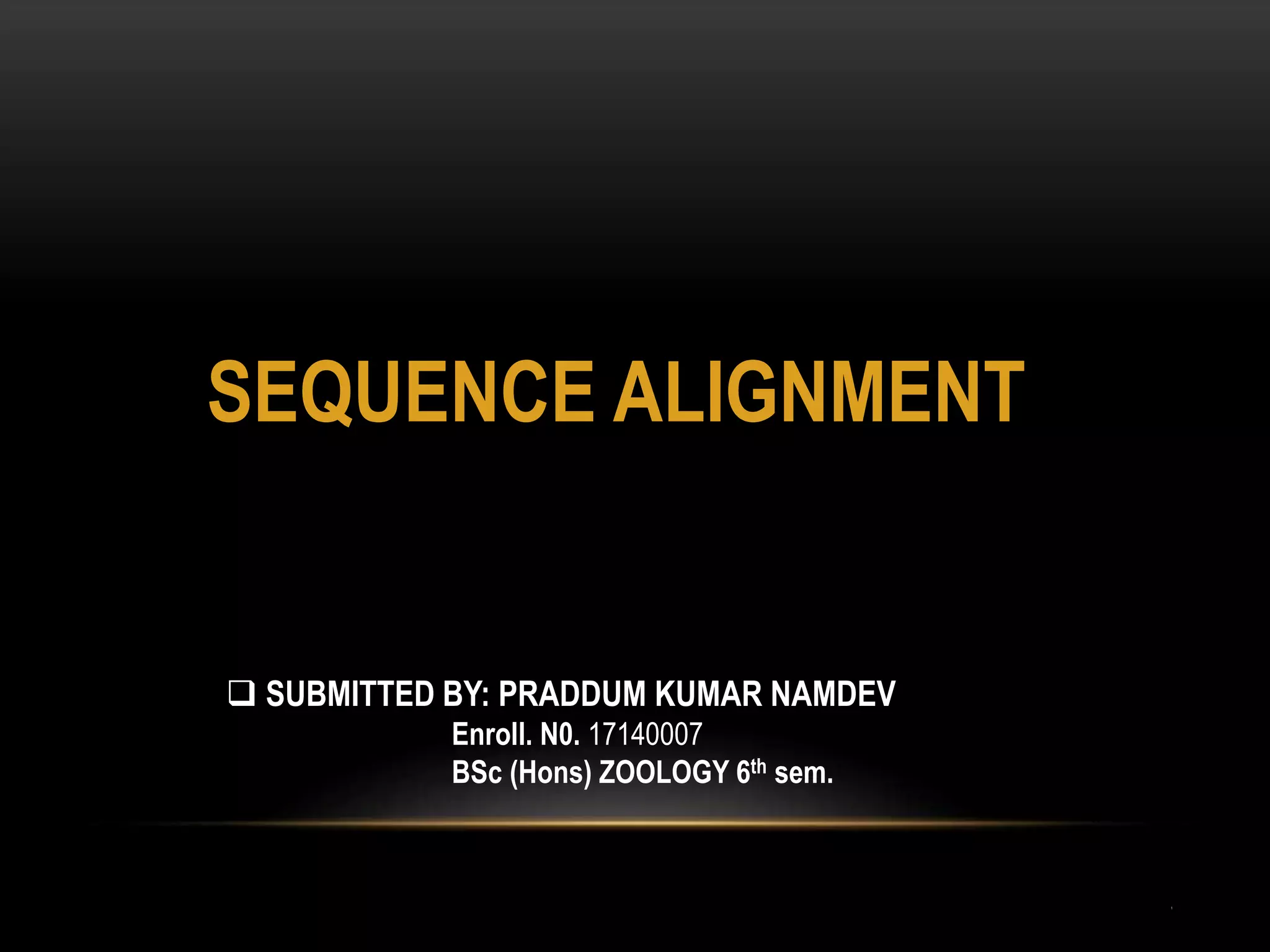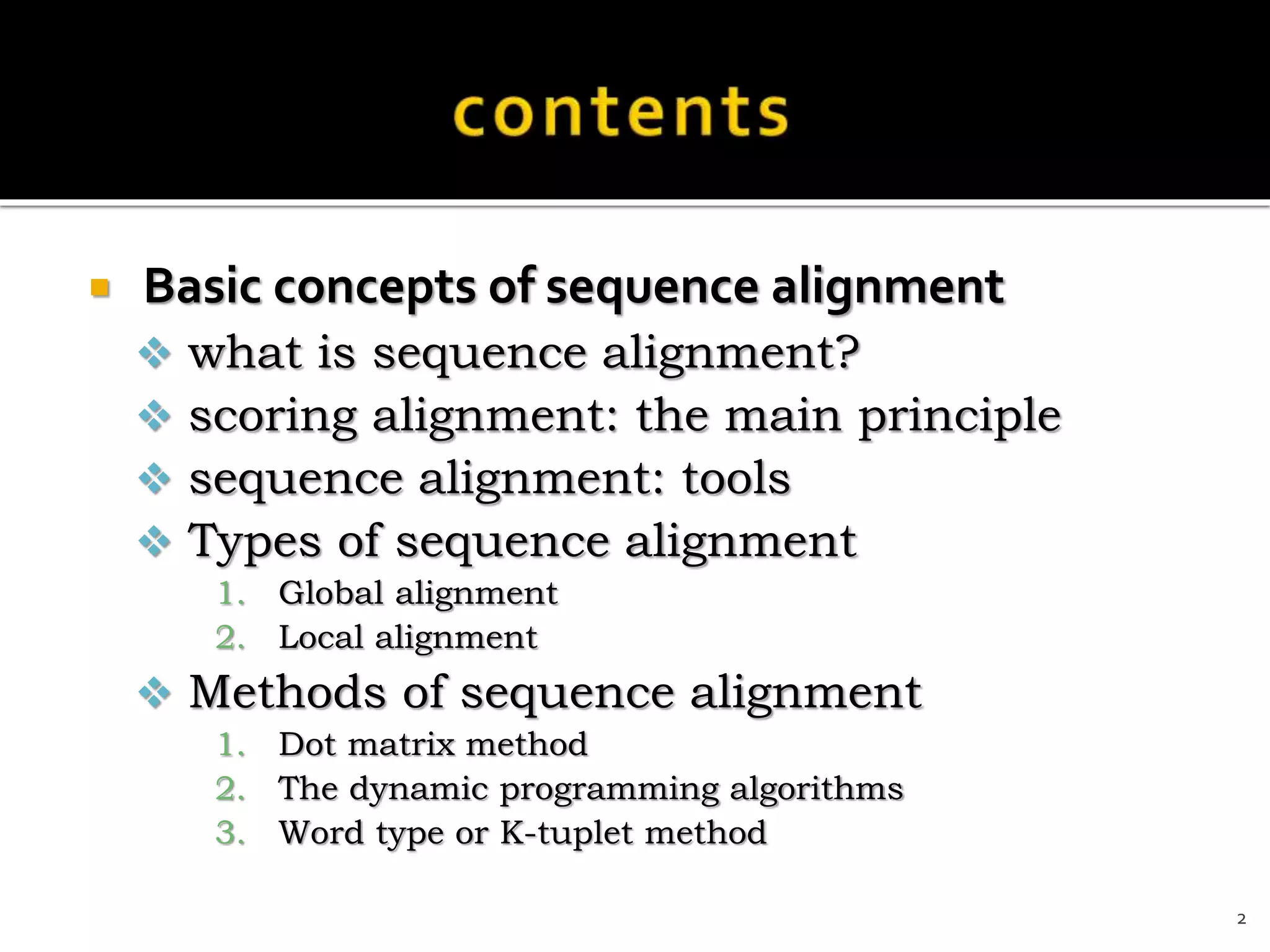 This document discusses sequence alignment, which involves arranging biological sequences like DNA, RNA, or proteins to identify regions of similarity. It covers the basic concepts of sequence alignment including global versus local alignment and different methods like dot matrix, dynamic programming, and word-based approaches. Dynamic programming is highlighted as the most common algorithm that uses a scoring system to find the optimal alignment between two sequences.
