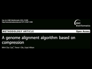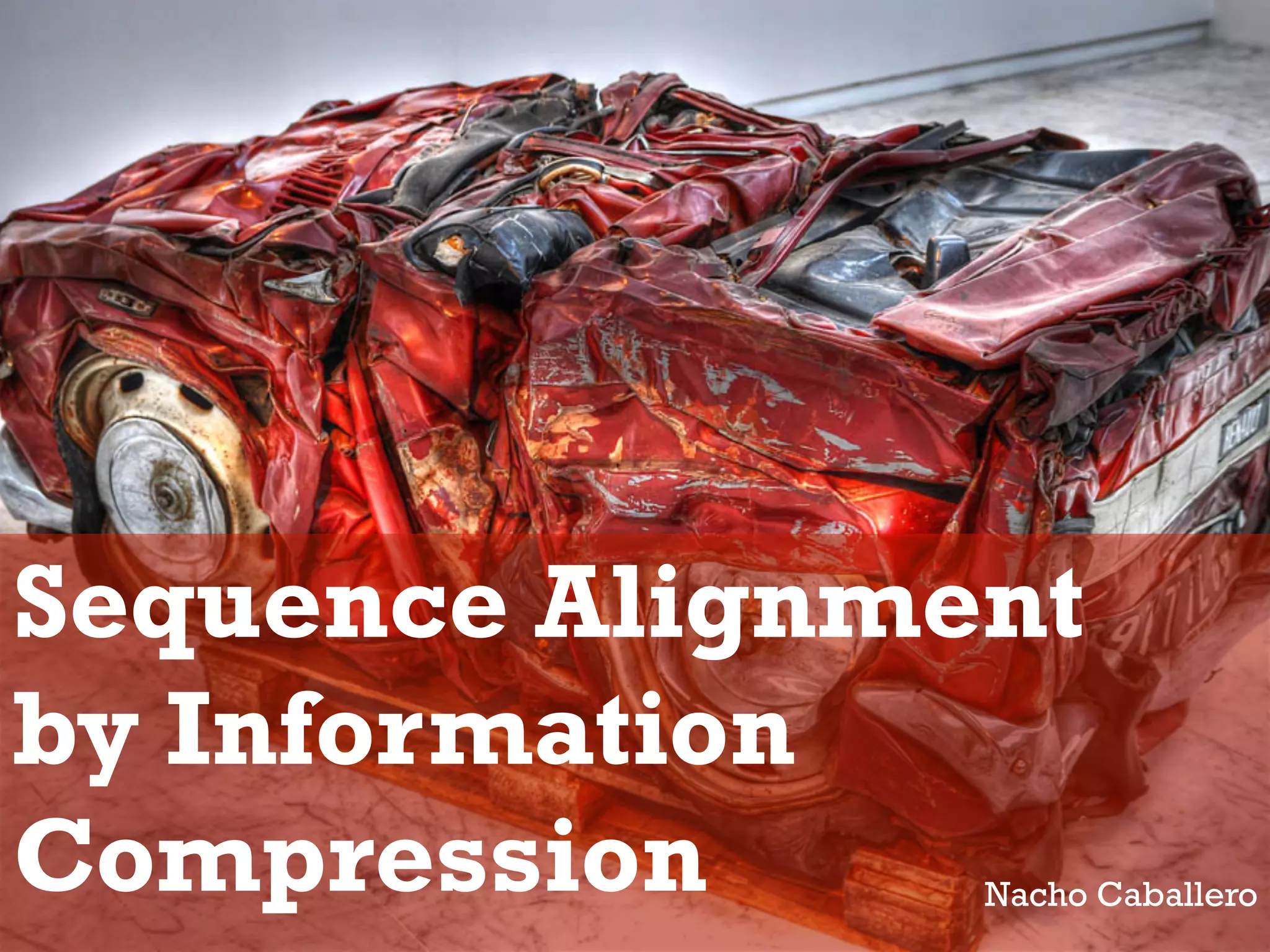 This document discusses using information compression to align biological sequences. It notes that traditional sequence alignment methods cannot handle low complexity regions or account for sequence biases. Information and probability are described as two sides of the same coin, with more similar sequences sharing more information. The document proposes aligning sequences by compressing them using a probabilistic model, asserting that homologous sequences will share information and compress better together. This alignment by compression approach is said to outperform traditional methods in aligning distantly related or biased sequences.