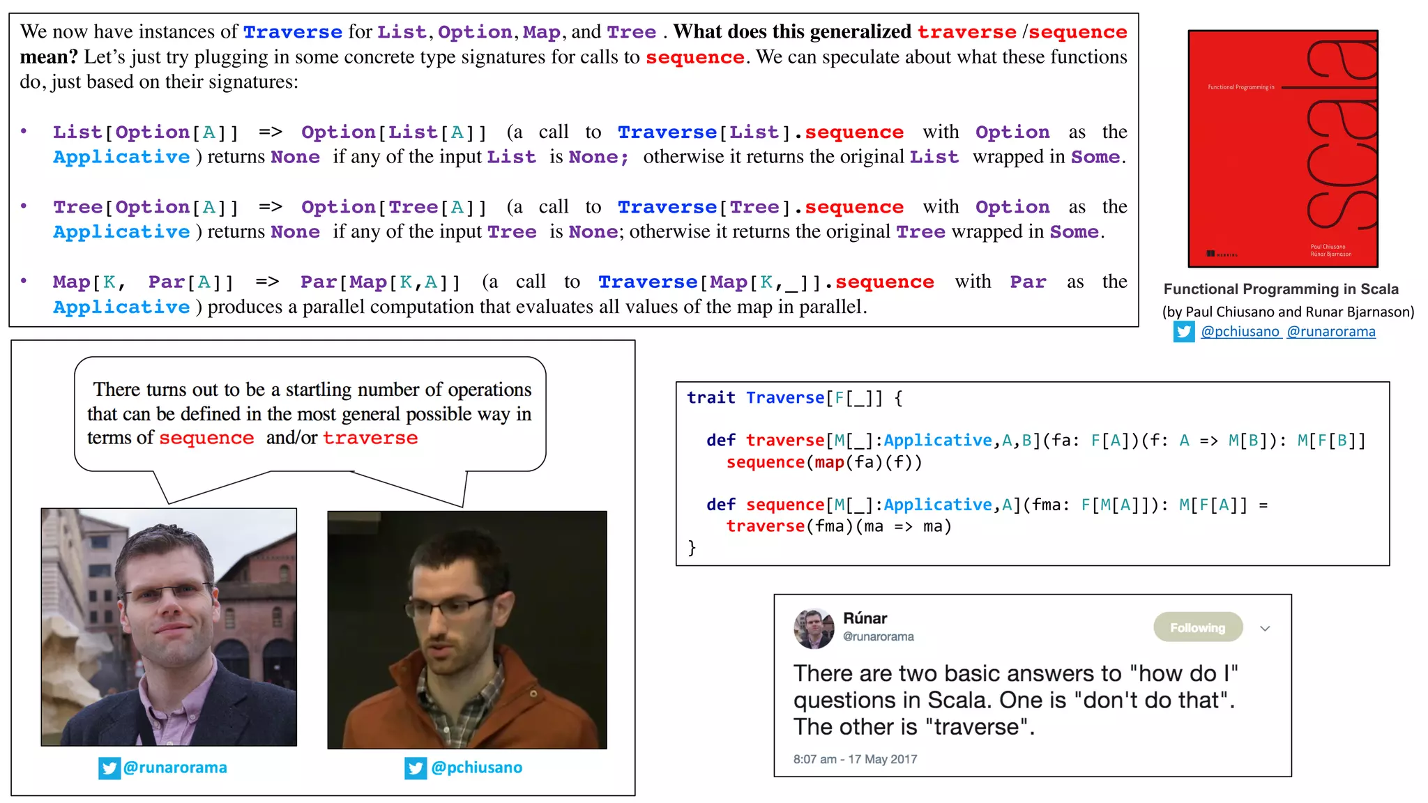 The document discusses 'traverse' and 'sequence' functions in functional programming within Scala, focusing on their application across different data types like lists, trees, and maps. It introduces concepts of monoids and foldable data structures, detailing operations and properties such as associativity and identity elements. Additionally, it emphasizes the utility of monoids and foldable types in writing generic code while providing practical examples and implementations.