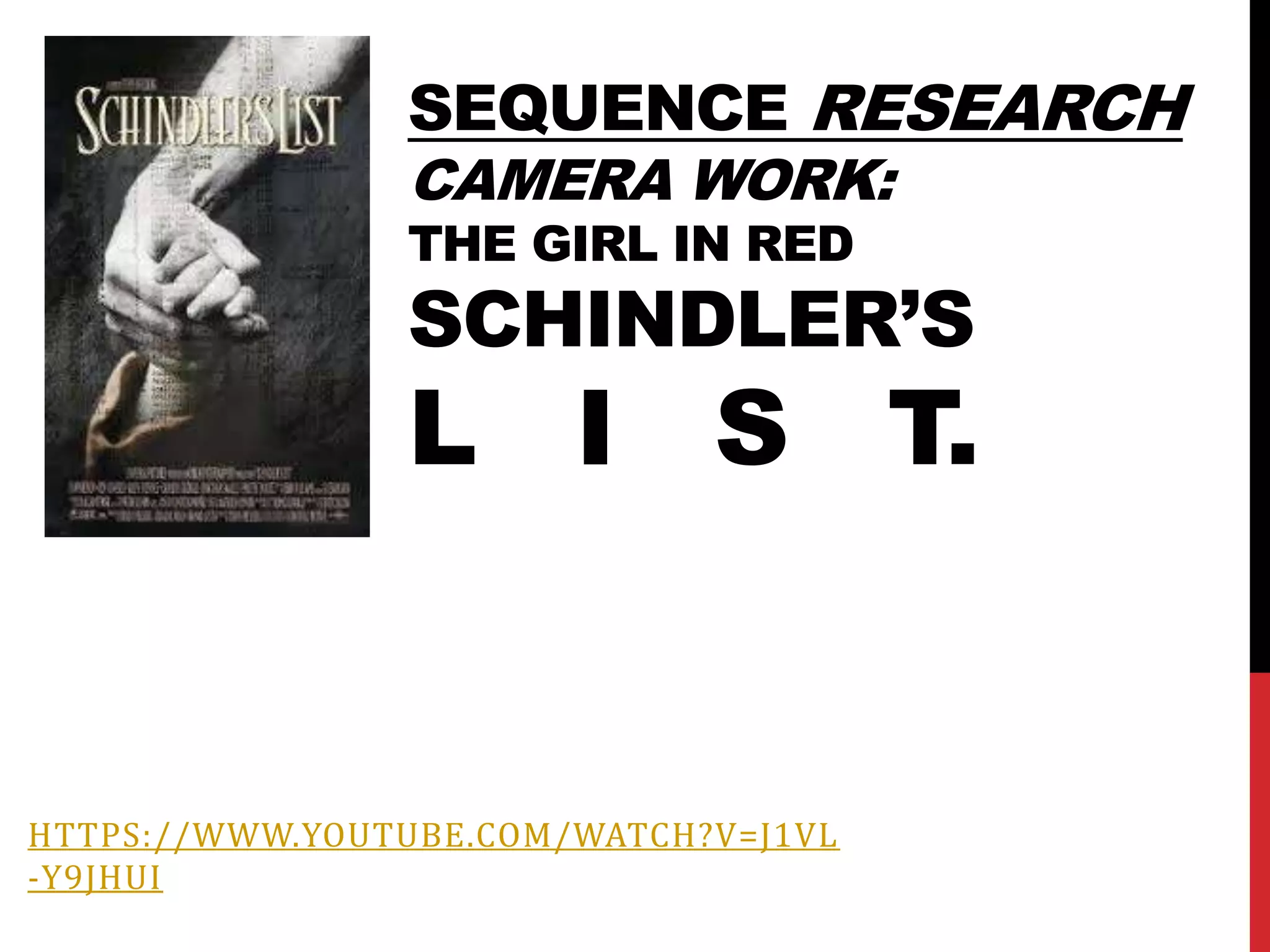 The document discusses the significant use of a little girl in a red coat in the film 'Schindler’s List,' symbolizing the individual suffering amid the vast tragedy of the Holocaust. Director Steven Spielberg employs various shot techniques to emphasize her innocence and vulnerability as she navigates through chaos and brutality perpetrated by Nazis. This portrayal serves as a powerful reminder of the human lives behind the statistics of the Holocaust, ultimately influencing the character Oscar Schindler's commitment to resisting the regime.