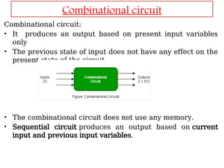 Sequential logic circuits are digital circuits where the output relies on both current and past inputs, enabling them to store information. They differ from combinational circuits that only consider current inputs and do not utilize memory, with examples including flip-flops and latches. The document discusses types of sequential circuits—synchronous and asynchronous—along with detailed applications and functionalities of memory elements such as flip-flops and latches.