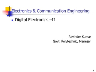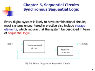 The document provides an extensive overview of sequential circuits and their components in digital electronics, focusing on synchronous sequential logic, types of latches and flip-flops, and their operation. It also explains how to analyze clocked sequential circuits using state equations, state diagrams, and various models such as Mealy and Moore machines. Additionally, it covers the design process for a simple sequential circuit, exemplified by a 2-bit up counter.