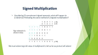 The document discusses different methods for multiplication of binary numbers, including combinational and sequential multipliers. A sequential multiplier uses one parallel adder, registers capable of shifting, and control logic. It multiplies digits through addition and shifting the registers. For signed multiplication, the multiplier and multiplicand may need to be complemented depending on their signs. Booth's algorithm can multiply signed numbers by adding or subtracting the multiplicand instead of just adding, reducing the number of operations.
