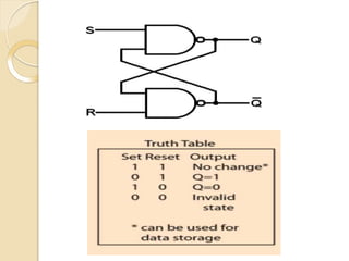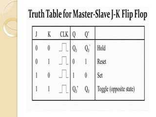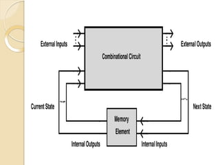 Sequential circuits have memory and their output depends on both the current inputs and past outputs. They contain combinational circuits and feedback loops using latches and flip-flops. There are two main types of sequential circuits - asynchronous which can change state anytime the inputs change, and synchronous which only change on a clock signal.