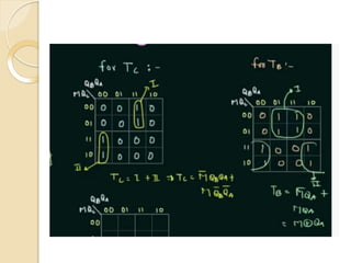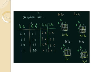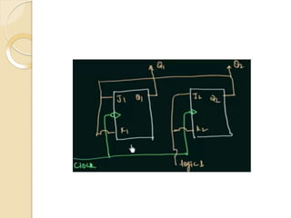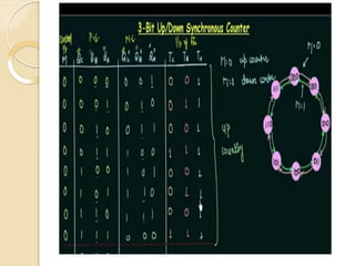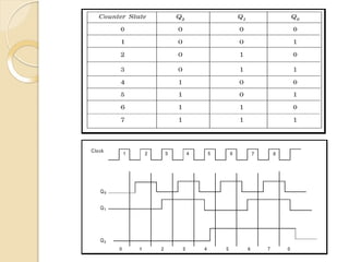 Latches continuously track inputs and can change output anytime, while flip-flops only change output on a clock signal. Common flip-flop types include SR, D, T, and JK. Counters are sequential circuits that cycle through a sequence of states on each clock pulse and are used to count events.