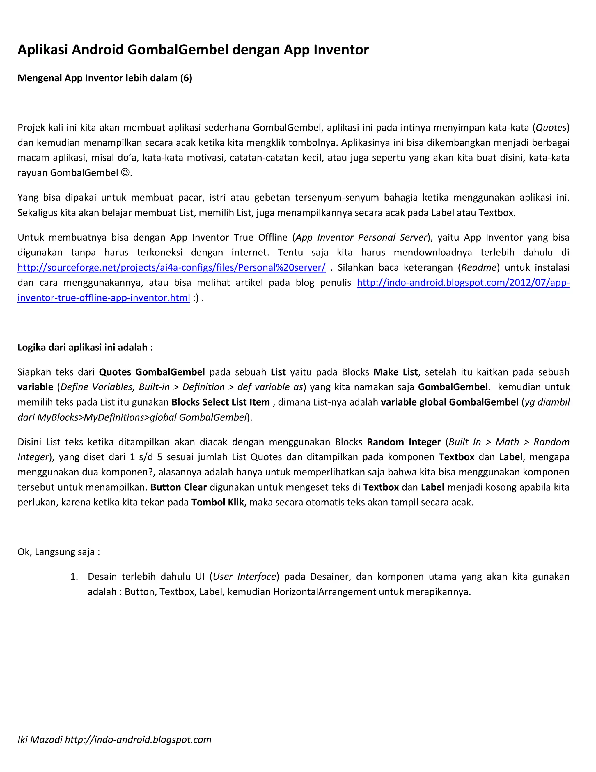 1. Artikel menjelaskan cara membuat aplikasi sederhana GombalGembel menggunakan App Inventor yang menyimpan dan menampilkan kata-kata rayuan secara acak.