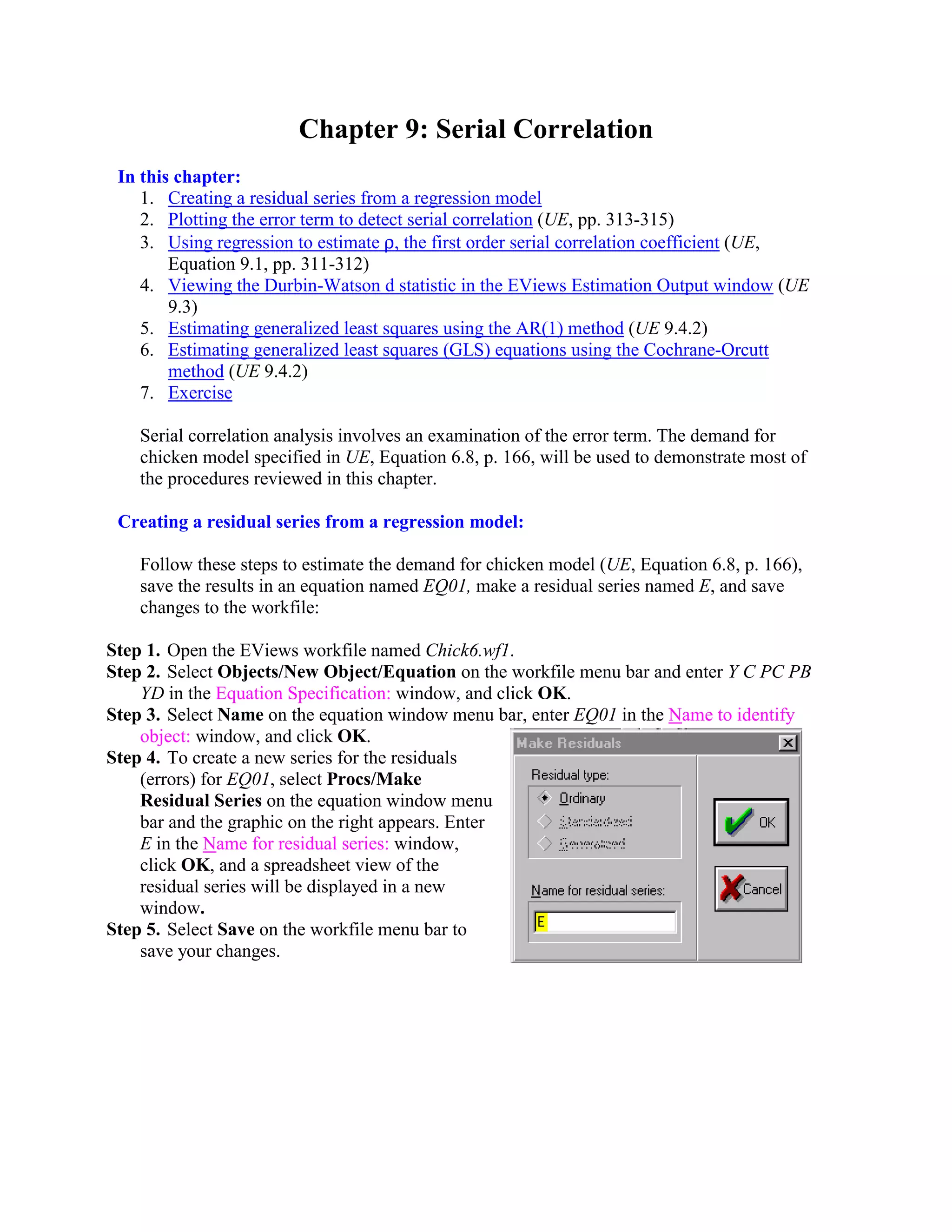 2) It provides step-by-step instructions for implementing these techniques in EViews, including estimating models with generalized least squares using the AR(1) and Cochrane-Orcutt methods.