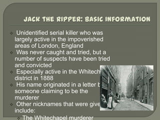 The Jack the Ripper serial killer was active in London in 1888, killing and mutilating at least five impoverished women in the Whitechapel area. Several suspects were proposed over the years, including Montague John Druitt, Seweryn Kłosowski (alias George Chapman), and Dr. Thomas Neill Cream. However, the killer was never identified and the crimes remain unsolved. The victims' throats were cut and some of their organs were removed, suggesting the killer had anatomical knowledge. The crimes were brutal and shocked Victorian London.