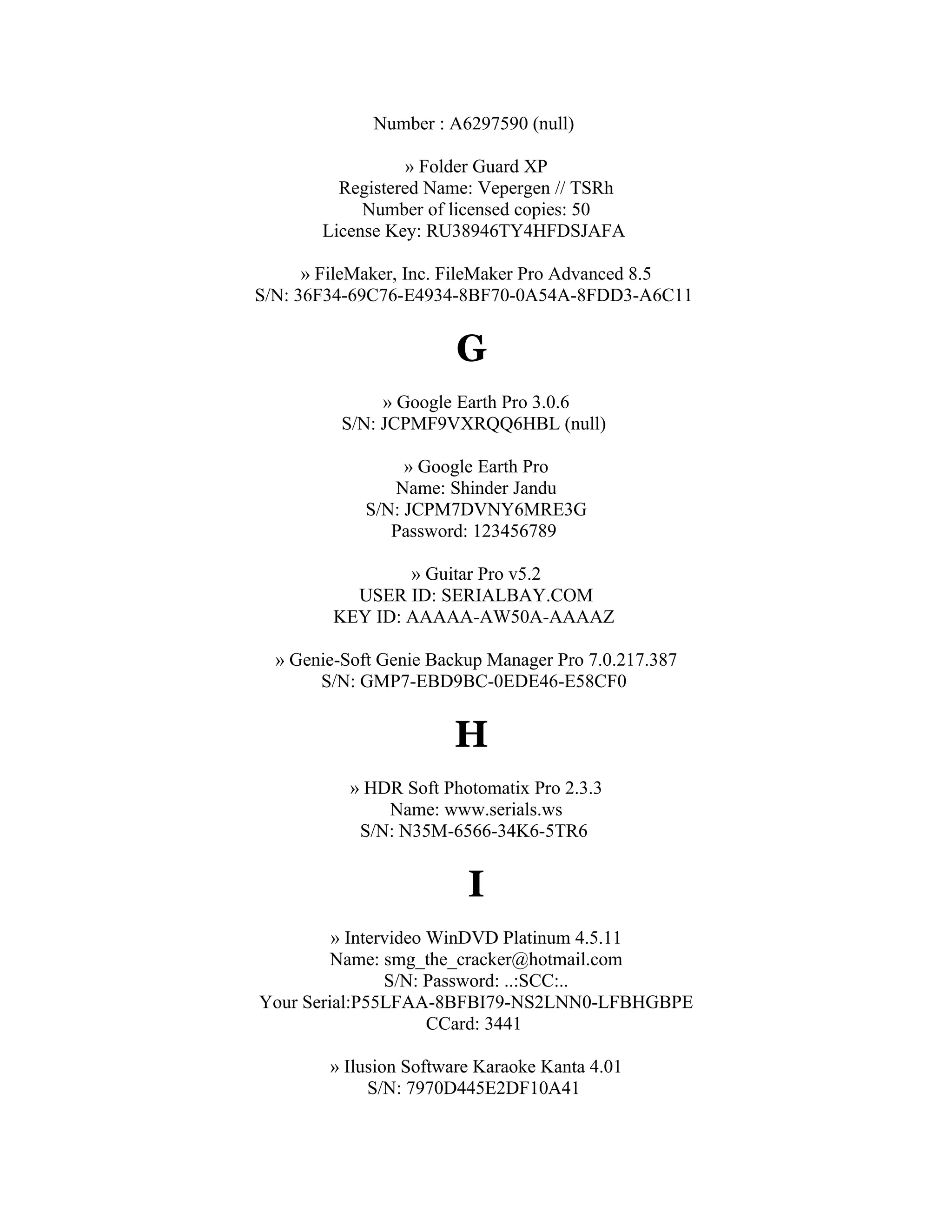 This document contains a list of software serial numbers and registration information. It includes serial numbers for products like Microsoft Office, Windows, Partition Magic, Pinnacle Studio, Norton Antivirus, and more. The serial numbers are attributed to various individuals and organizations.