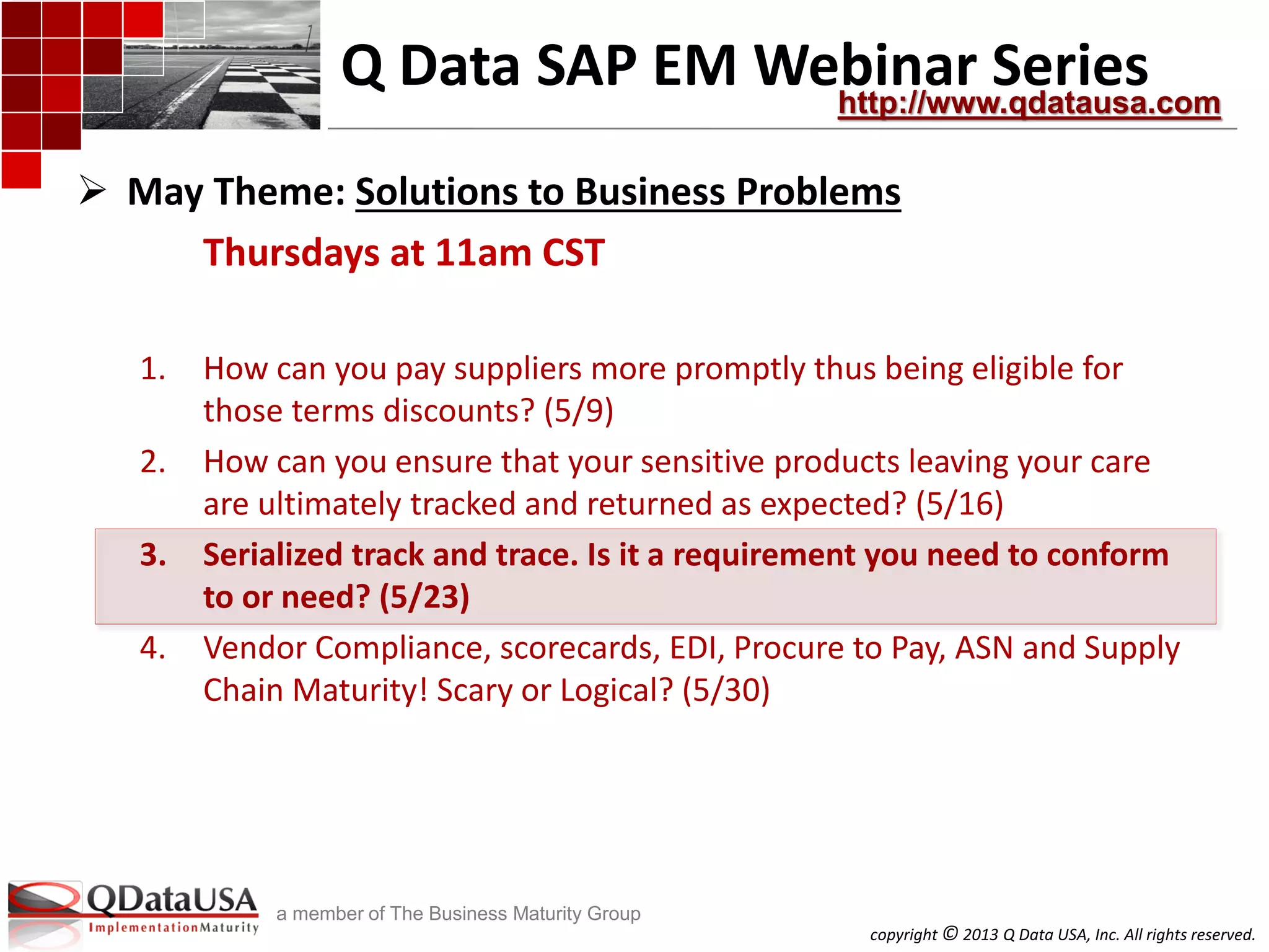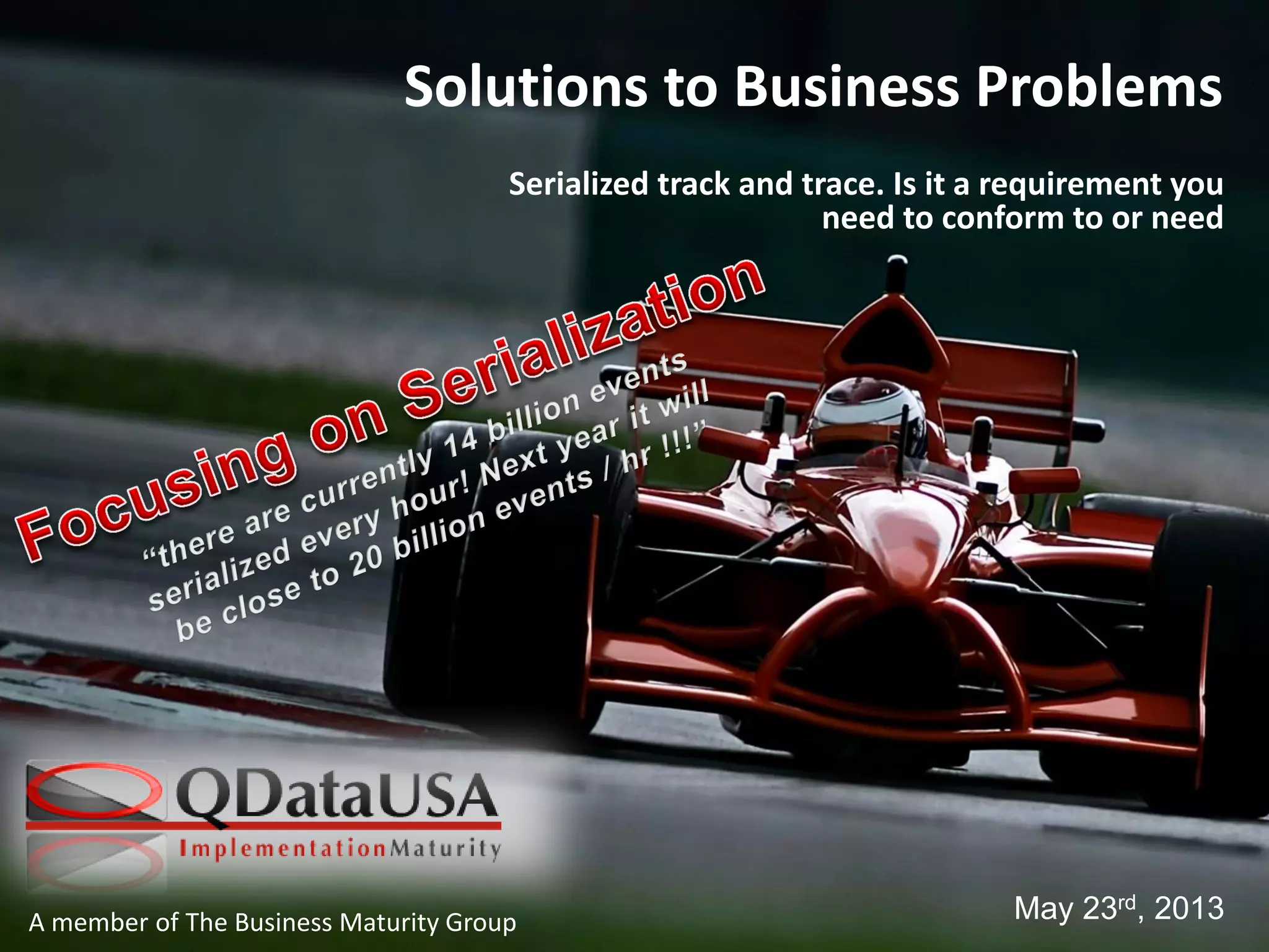 The document discusses serialized track and trace and solutions to business problems. It provides an agenda for a webinar on serialized track and trace, including vocabulary, standards, components, and regulations. It then covers various topics in depth, such as chain of custody, unique identification standards like GTIN and RFID, and SAP solutions for implementing auto-ID and item serialization.