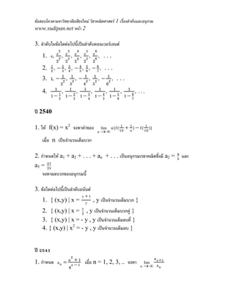 เรื่องลําดับและอนุกรม WWW.SUDIPAN.NET ป 2537 1. สําหรับ an ในขอใดที่เปนลําดับไดเวอรเจนต n +1 2. an = 3 − 2n 2 1. an = ( n ) sin ( π) n n2 − 1 3. an = 2n + 10 3n 4. an = 3n 2n ∞ 2. จงหาผลบวกของอนุกรม ∑ (−1) n cos n ( π) n=0 3 ป 2538 ∞ (−1) n + 1 e n 1. ผลบวกของอนุกรม ∑ n −1 เทากับขอใด n =1 3 e 1. 3 + e e 2. 3 − e 3. 3 3 e e 4. 3 3 e e + − lim 2n(1 − 5 n) n 2. จงหาคาของ n →∞ (n + 1) 5 ป 2539 ⎡ 12 + 22 + 32 + ... + ( n − 1)2 ⎤ 1. จงหาคาของ lim ⎢ ⎥ n →∞ ⎣ n3 ⎦ ∞ 2. ให Sn เปนผลบวกของ n พจนแรกของอนุกรม ∑ a n ถา Sn = 3–n n =1 จงหา a1 , a2 , a3 , a4 1. 3 , − 9 , 27 , − 81 1 2 2 2 2. 3 , − 9 , − 27 , − 81 1 2 2 2 3. 3 , − 9 , 27 , − 81 1 1 1 1 1 1 1 1 4. 3 , 9 , 27 , 81