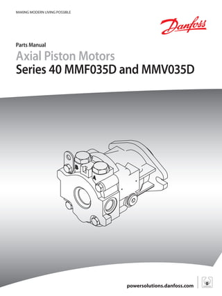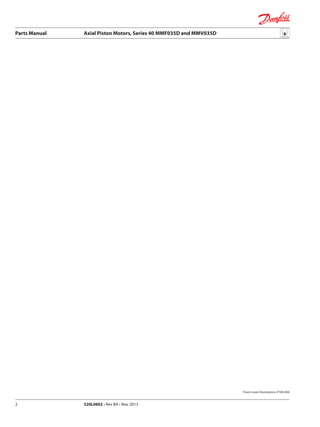 This document is a parts manual for Danfoss axial piston motors in the Series 40 MMF035D and MMV035D. It provides information on identifying parts using the nameplate, order code, item numbers, and date codes. It also lists service parts for fixed and variable displacement motors, including input shafts, end caps, seals, and common parts. The manual contains service bulletins with additional part interchange information.