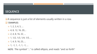 The document defines and provides examples of sequences, series, arithmetic progressions, and geometric progressions. It gives the formal definitions and notations used to represent these concepts. Several examples are worked through to demonstrate finding explicit formulas for sequences based on given terms, computing specific terms of sequences, and identifying terms of sequences based on given properties like the first term, common difference or ratio, and a target term value.