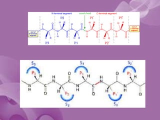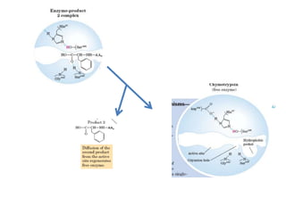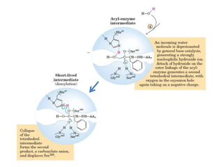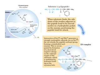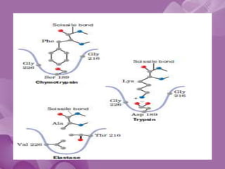 Serine proteases are a large family of enzymes characterized by a serine residue at their active site that cleaves peptide bonds. They include pancreatic proteases like trypsin and chymotrypsin, which differ in specificity and regulation based on structural variations in their active sites. The enzymes operate through a catalytic mechanism involving a catalytic triad and oxyanion hole, with certain proteases synthesized as inactive zymogens that are activated through proteolysis.